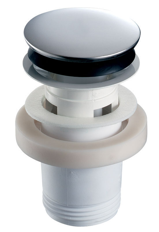 Art. 581000Waschtisch-Ablaufventil G 1 1/4B mit Edelstahl-Ablaufhaube, geöffnet für freien Wasserablauf.