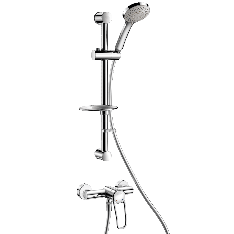 • Höhenverstellbare Handbrause (Art. 813) auf verchromter Brausestange mit Brauseschieber und Seifenablage (Art. 821) und Brauseschlauch (Art. 836T1).