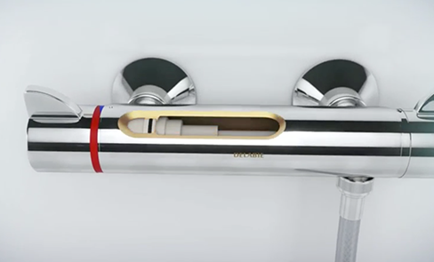 Sequentielle, verkalkungsarme Thermostatkartusche für Einhandsteuerung von Durchflussmenge und Temperatur.