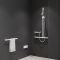 Position der vertikalen Stange kann bei der Montage eingestellt werden: Stange kann nach links oder rechts verschoben werden und passt sich so an die Installation an (Platzierung der Armaturen, Tiefe des Duschsitzes etc.).
