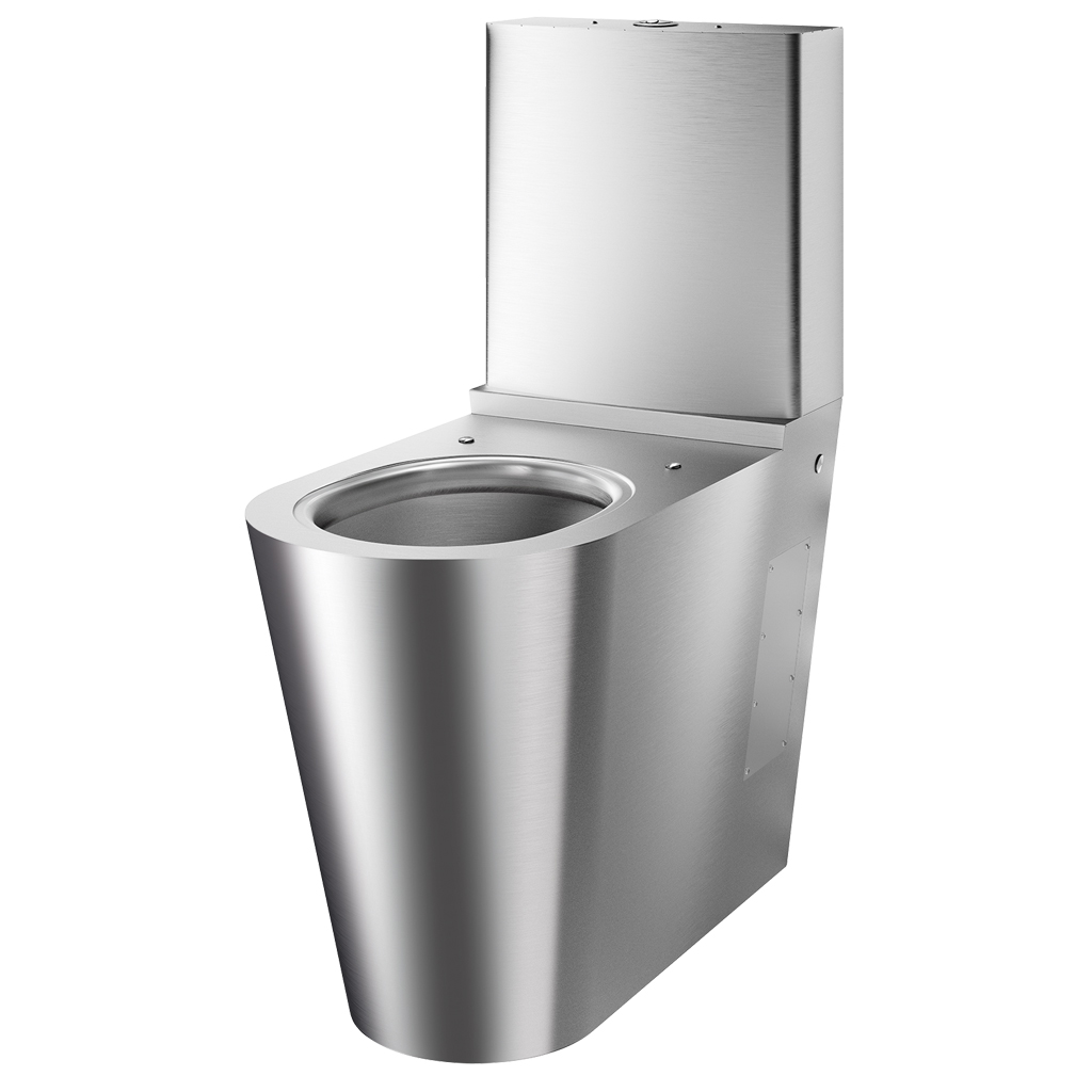 Mit Bohrungen für WC-Sitzbefestigung. Durch Edelstahlstopfen verschlossen für den Fall einer Nutzung ohne WC-Sitz.