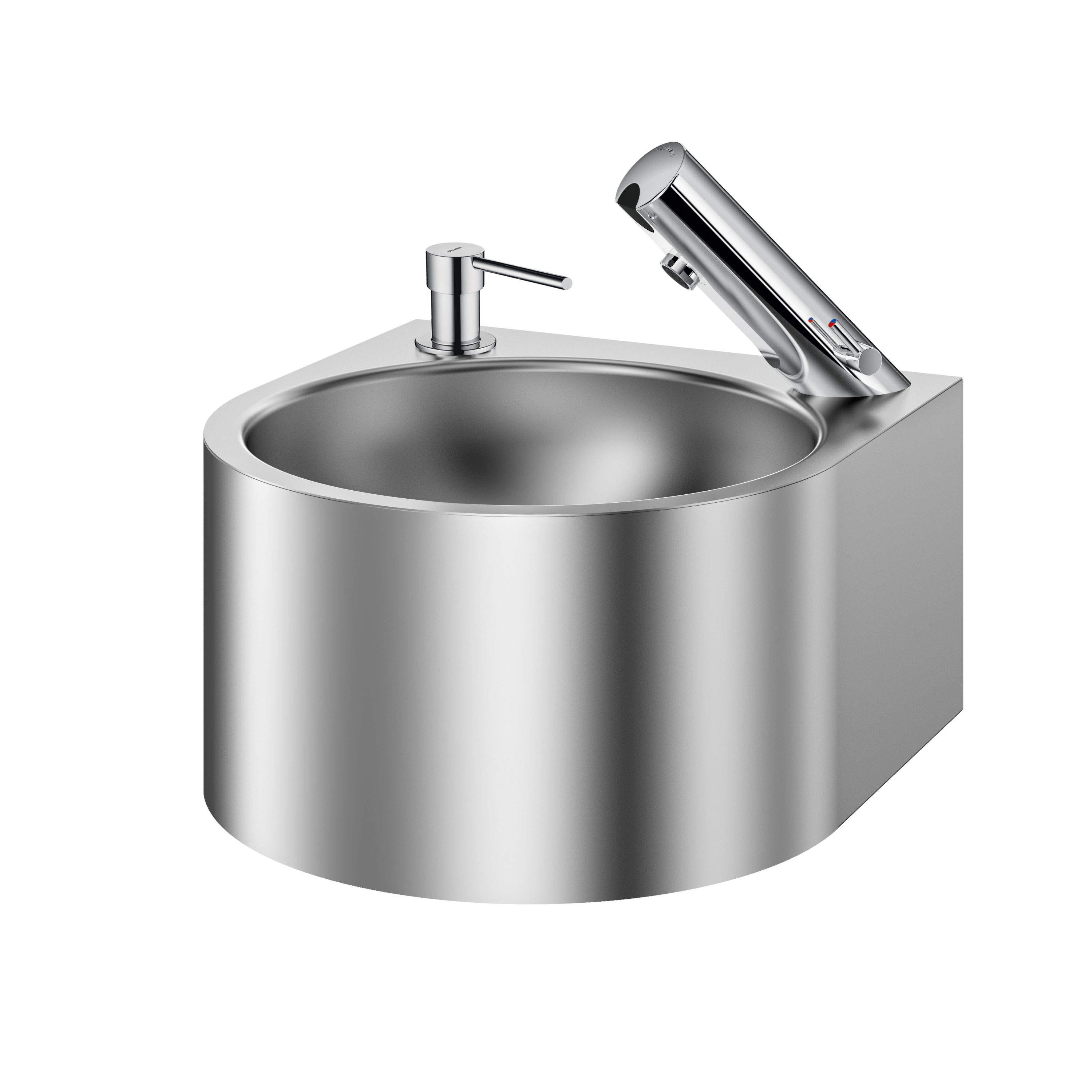 Mit elektronischer Mischbatterie, integrierter Batterie und Magnetventil und Spender für Seife bzw. hydroalkoholisches Desinfektionsgel aus Edelstahl Werkstoff 1.4301.