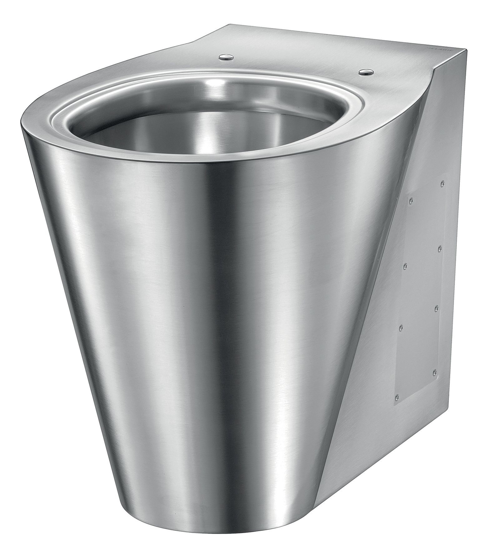 Mit Bohrungen für WC-Sitzbefestigung. Durch Edelstahlstopfen verschlossen für den Fall einer Nutzung ohne WC-Sitz.