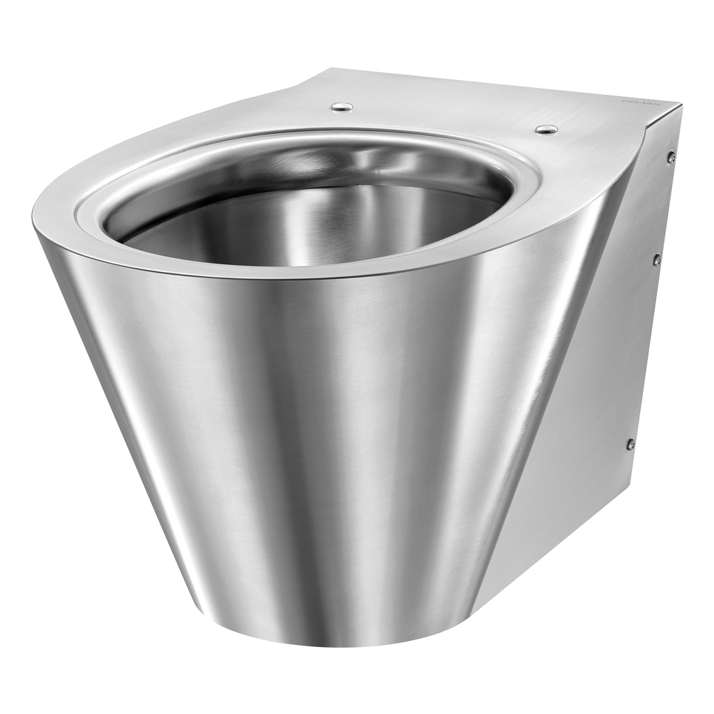Mit Bohrungen für WC-Sitzbefestigung. Durch Edelstahlstopfen verschlossen für den Fall einer Nutzung ohne WC-Sitz.