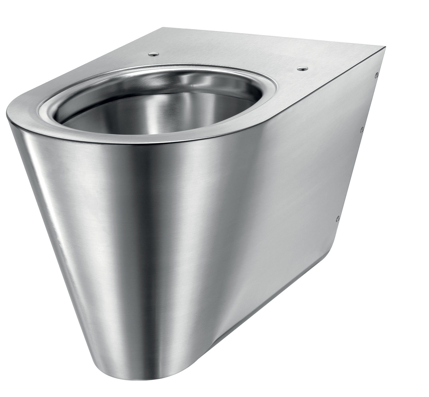 Mit Bohrungen für WC-Sitzbefestigung. Durch Edelstahlstopfen verschlossen für den Fall einer Nutzung ohne WC-Sitz.