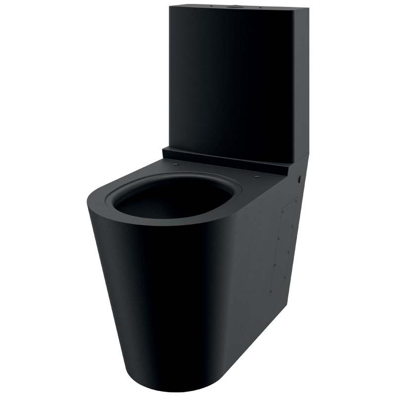 Mit Bohrungen für WC-Sitzbefestigung. Durch Edelstahlstopfen matt schwarz verschlossen für den Fall einer Nutzung ohne WC-Sitz.